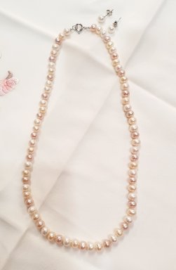 Deze verfijnde juwelenset bestaat uit echte zoetwaterparels met een zachte, natuurlijke glans die het licht subtiel reflecteert.