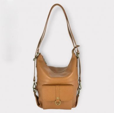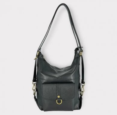 De tas heeft een praktische voorzak met flap en metalen ringdetail, wat zorgt voor een stijlvolle en robuuste uitstraling.